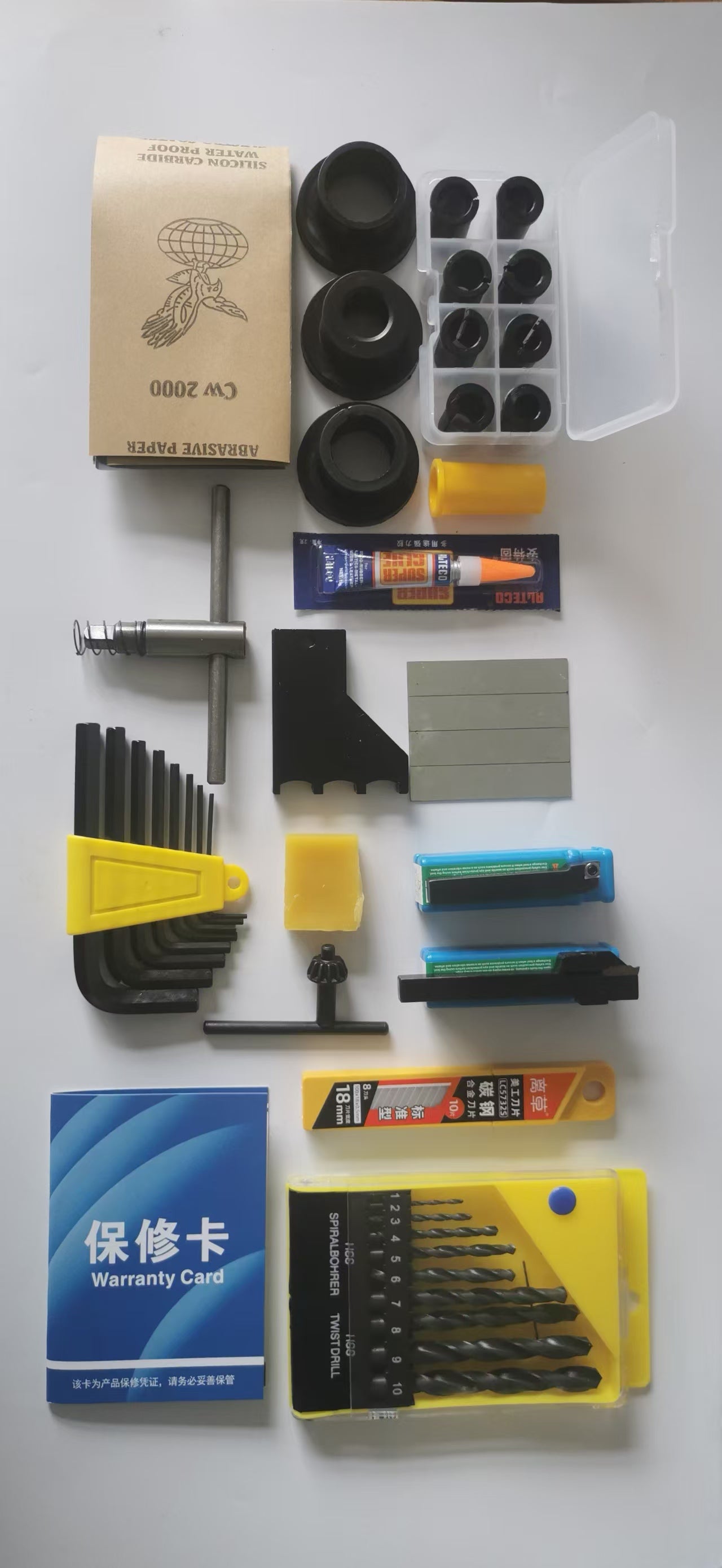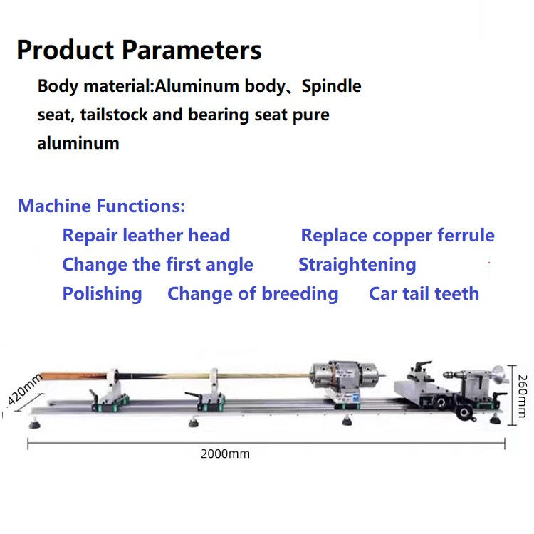 【Machine Function】: The pool cue repairing machine is mainly used for the maintenance and repair of various cues, such as replacing leather heads, copper hoops, changing the first angle, polishing and grinding the cue, making copper hoops and first angles, changing counterweights, changing tapers, connecting teeth, slotting, wrapping handles, etc.